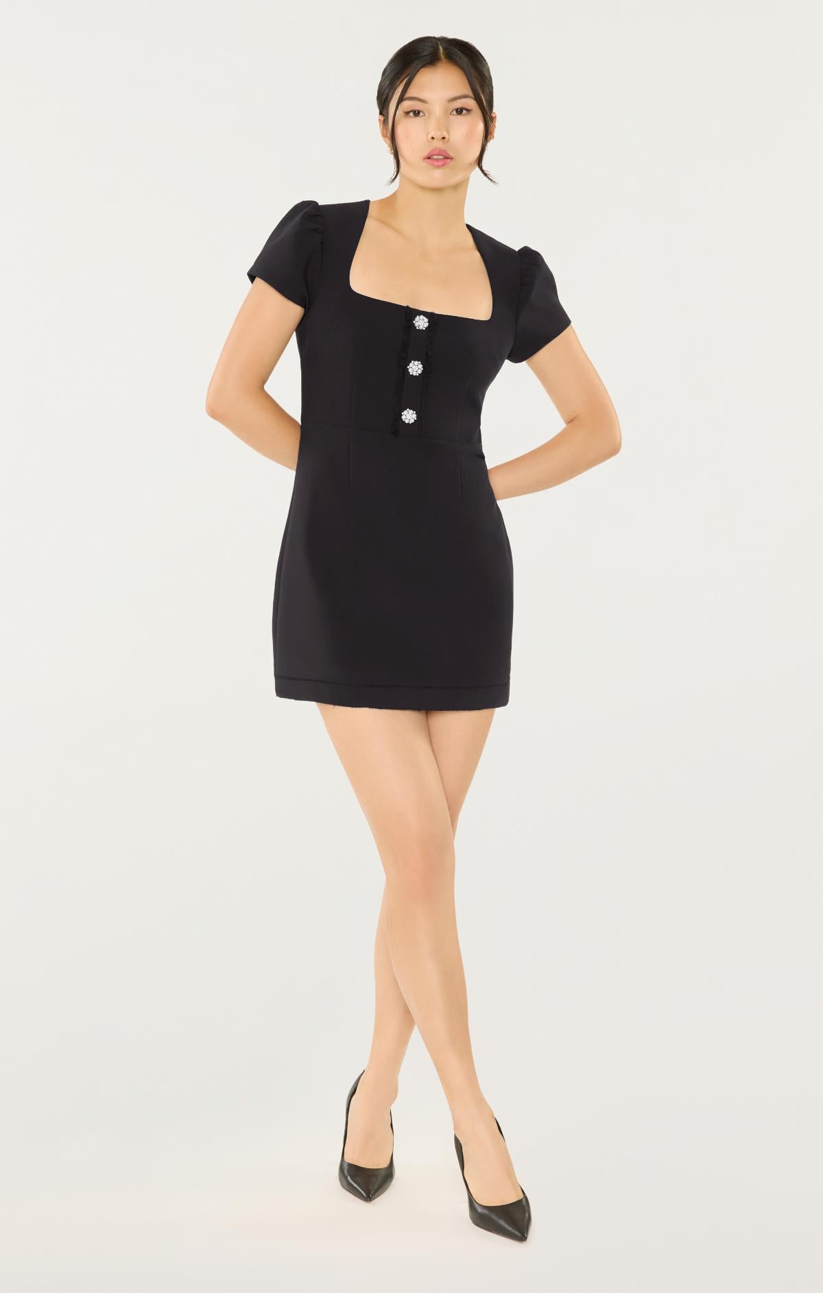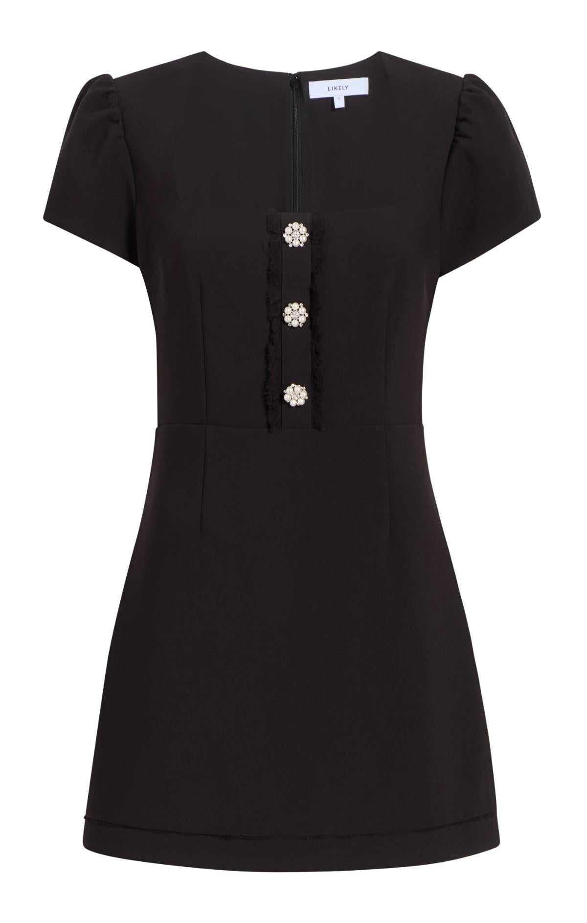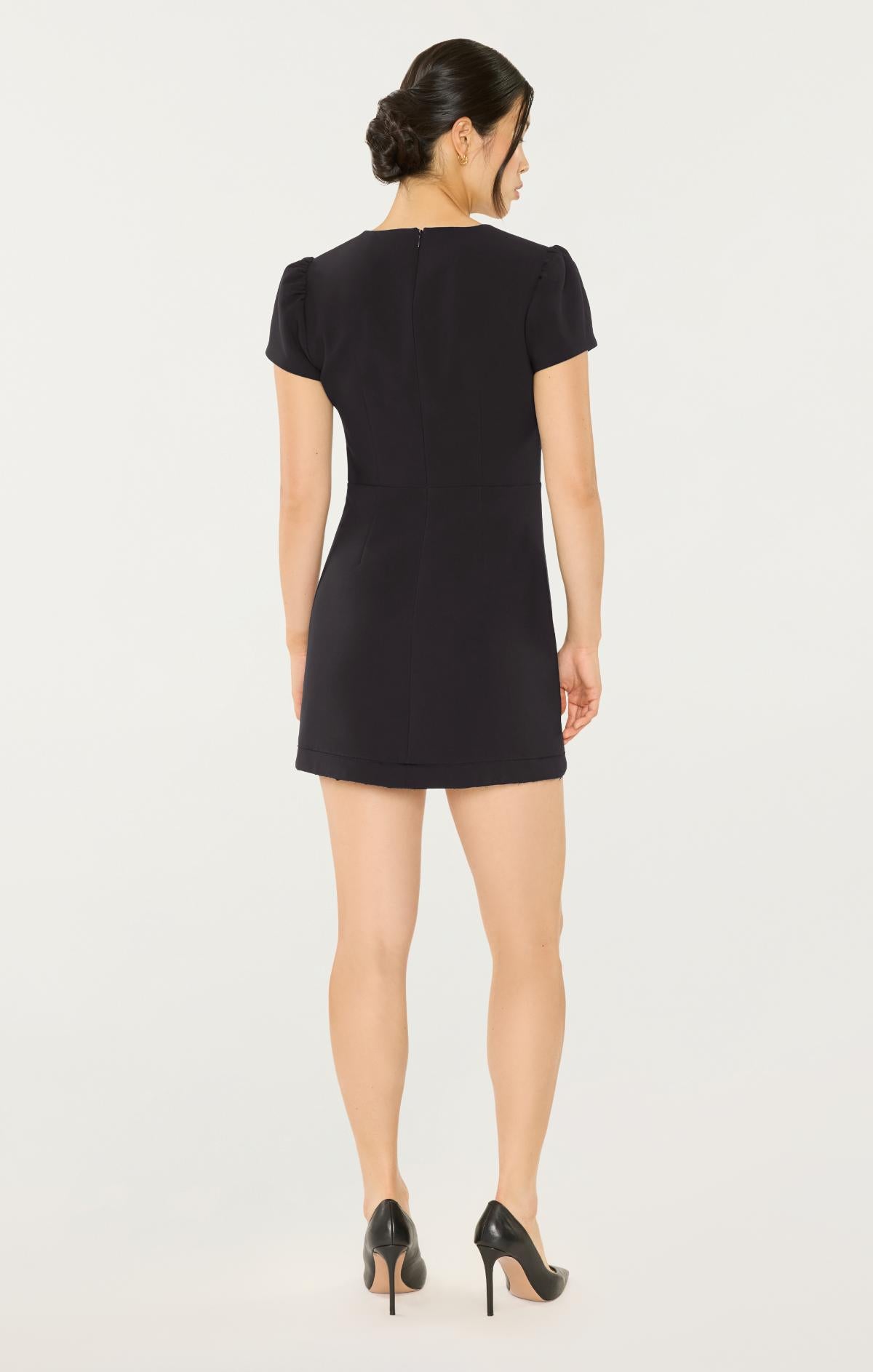 The Westy Dress combines timeless sophistication with everyday versatility. Its unique neckline and short sleeves create a flattering frame, while embellished buttons add refined detail. An ideal choice for daytime occasions.