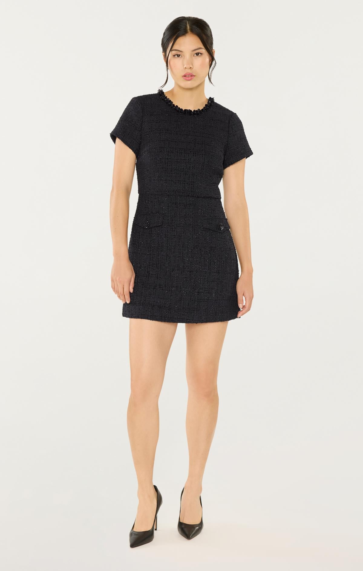 The Daria Dress delivers timeless elegance in a compact silhouette. Delicate sequins trace the rounded neckline, creating a subtle shimmer that catches the eye. Short sleeves offer a refined proportion, while functional front pockets are elevated with embellished buttons — a signature detail that speaks to thoughtful design.