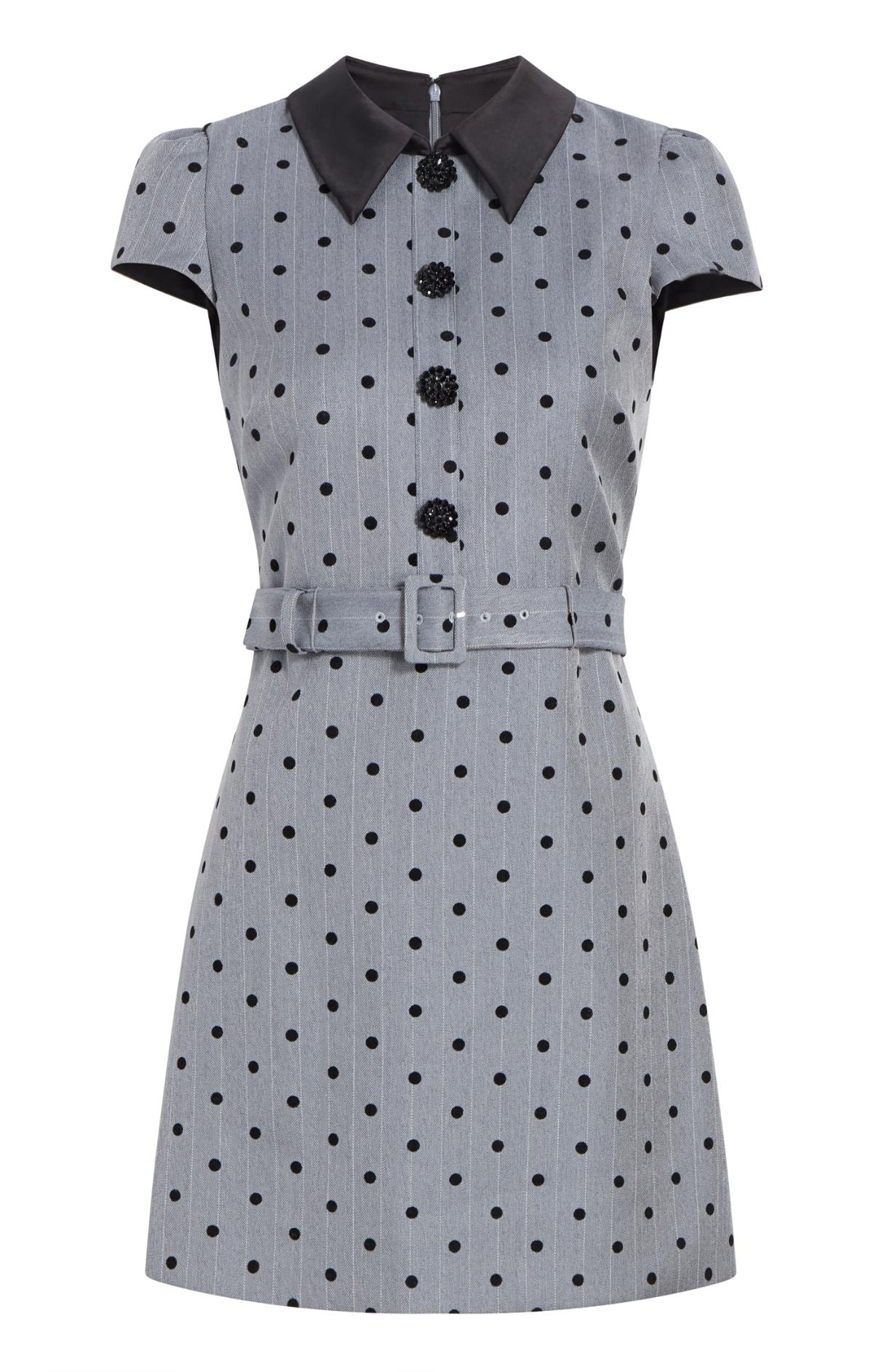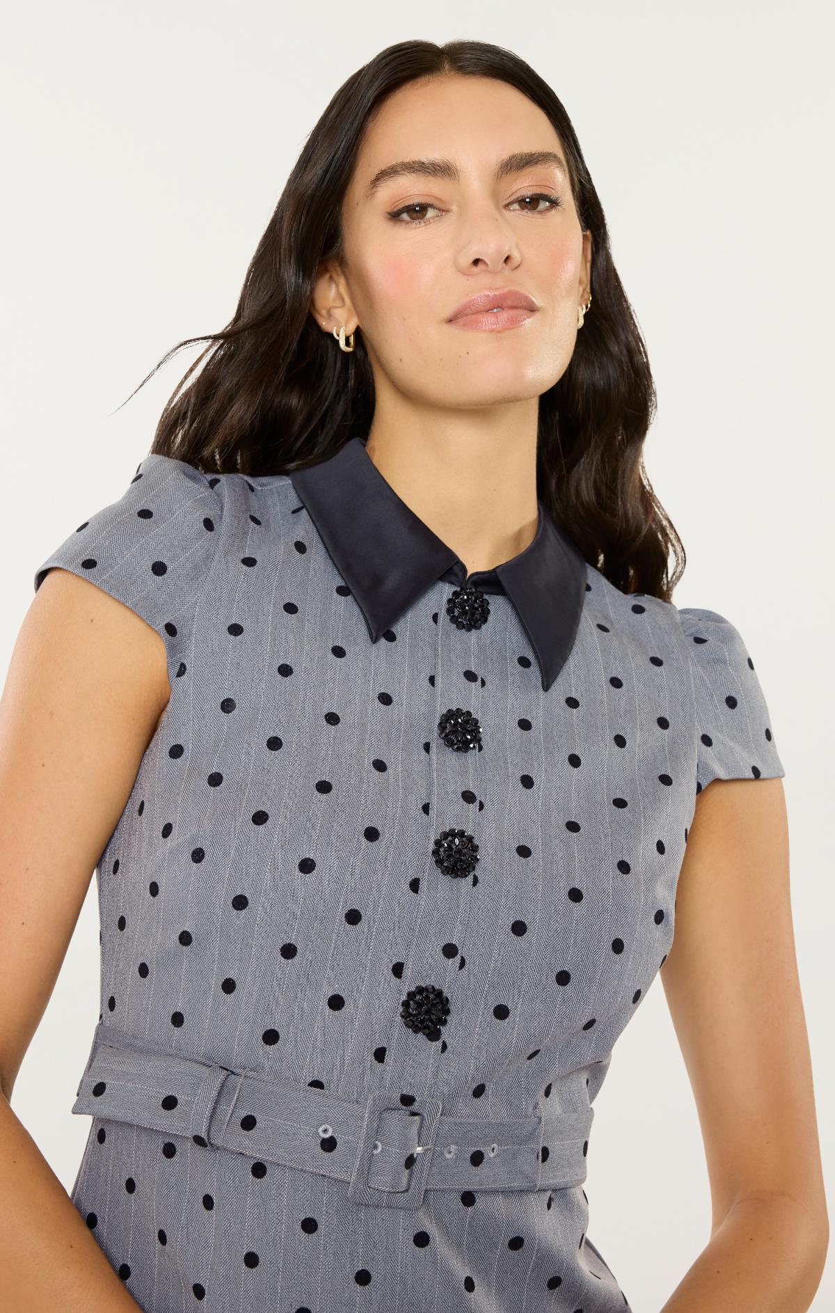 The Poppette Dress embodies refined elegance with its striking polka dot pattern. This mini dress features a structured collared neckline, short sleeves, and a front button placket for a polished silhouette. The distinctive frame-style belt detail cinches the waist creating a flattering focal point.